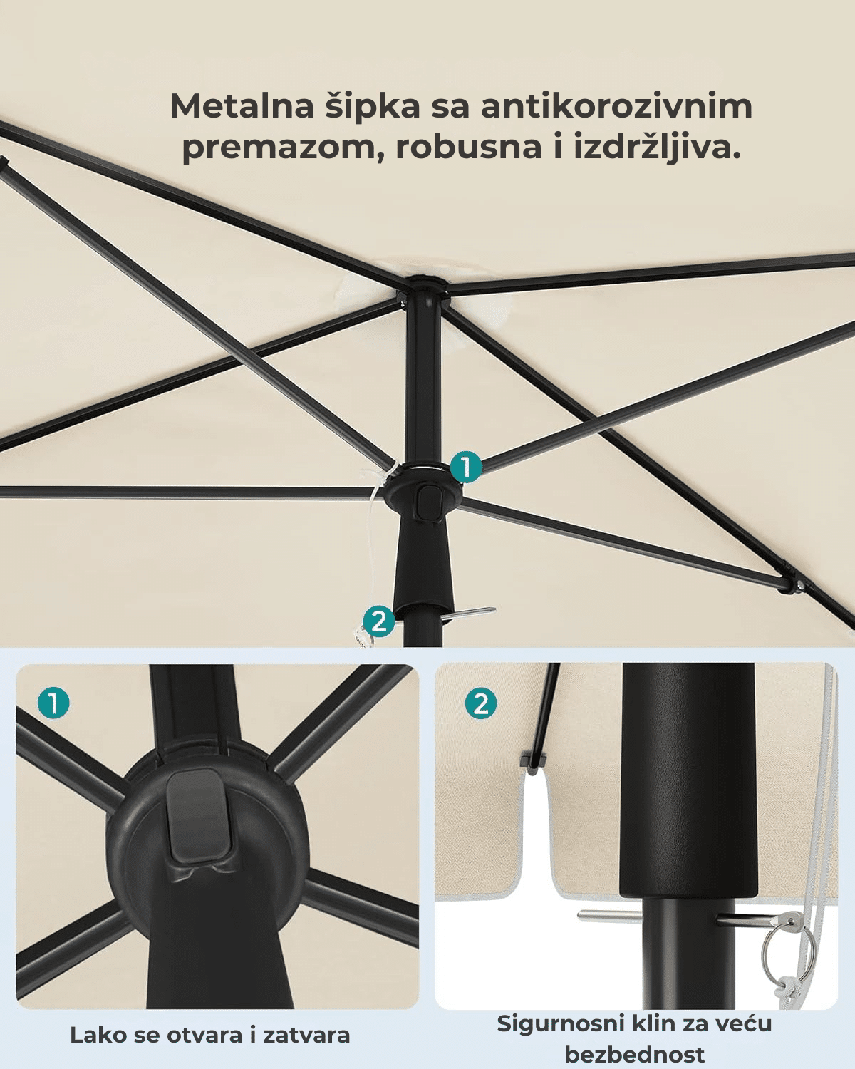 Ne dozvolite da vam nestabilan suncobran pokvari odmor. Metalni sigurnosni graničnik ispod mehanizma zaključava konstrukciju i sprečava da se suncobran iznenada zatvori, tako da možete bezbrižno uživati u hladovini.