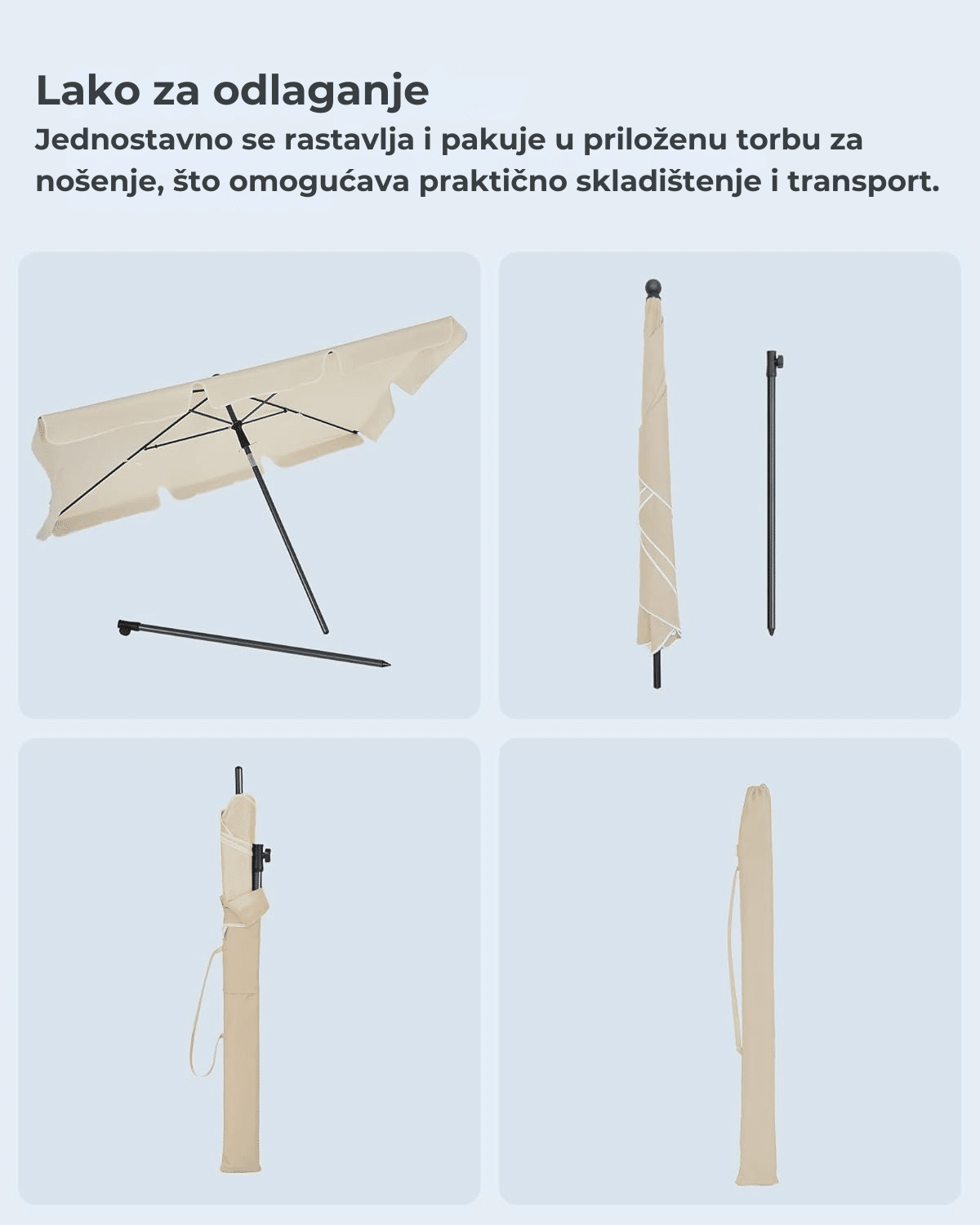 Poželeli ste dan na plaži? Nema problema. Zahvaljujući priloženoj torbi za nošenje, ovaj suncobran za balkon i terasu možete lako poneti sa sobom. Jednostavno se sklapa i rasklapa, pa brzo stvara prijatnu hladovinu gde god vam zatreba.