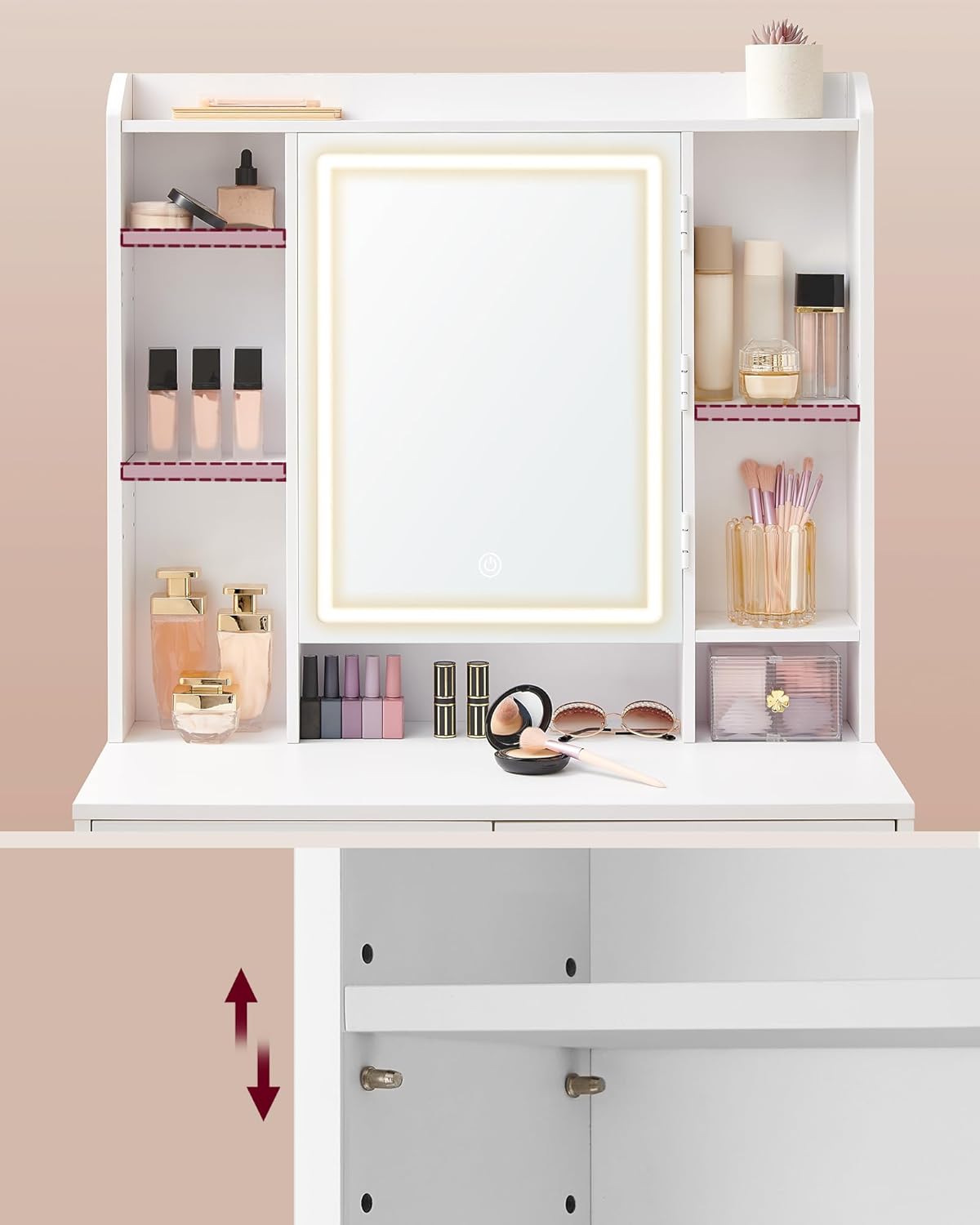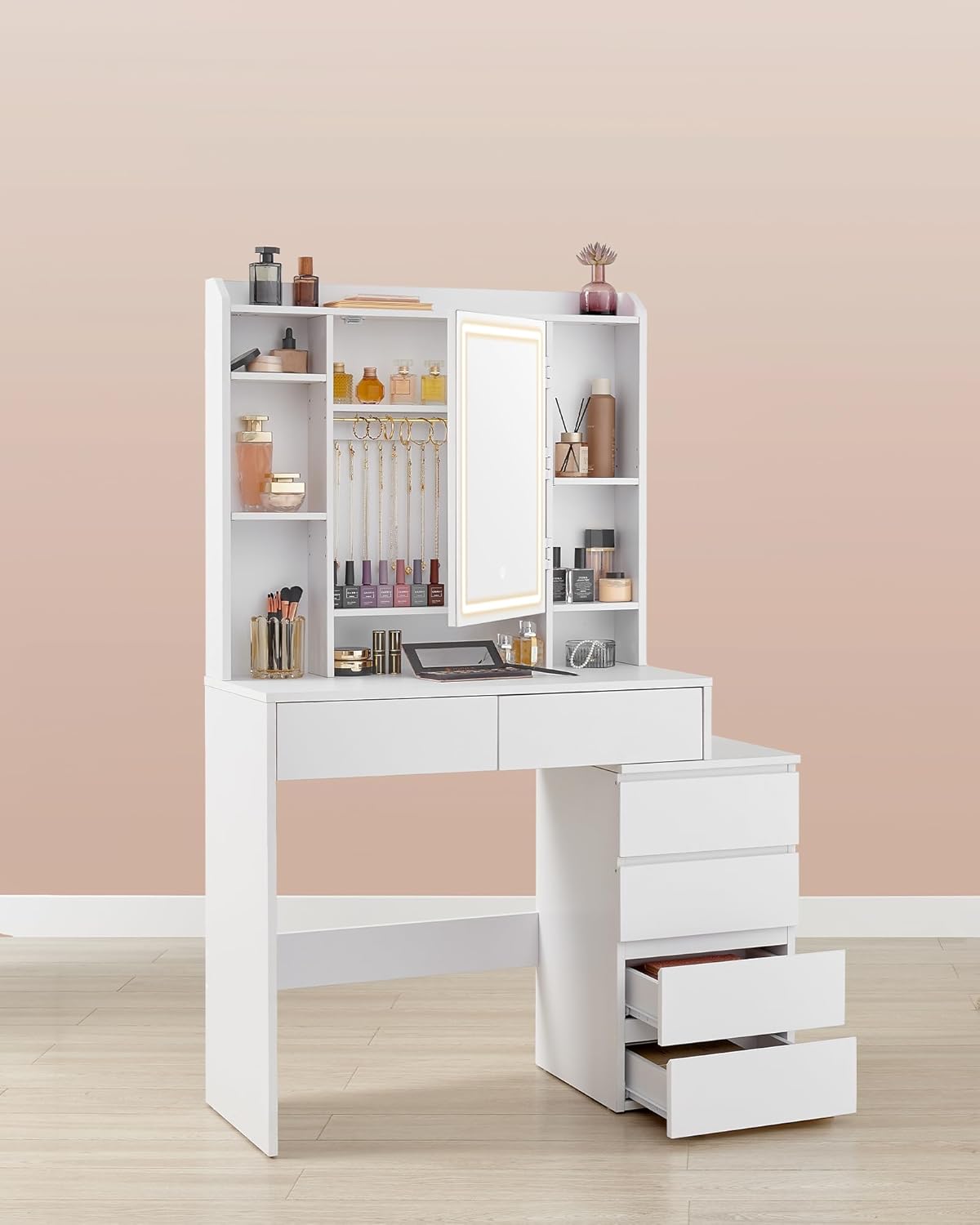 Ovaj toaletni sto sa ogledalom i LED osvetljenjem pruža izuzetno veliki i pametno organizovan prostor za odlaganje, idealan za sve vaše kozmetičke i svakodnevne stvari. Sa jednom gornjom policom, čak sedam otvorenih pregrada, dve velike fioke, dodatnim policama i kukama iza ogledala, kao i ormarićem sa četiri fioke, omogućava maksimalnu organizaciju i urednost bez nereda.