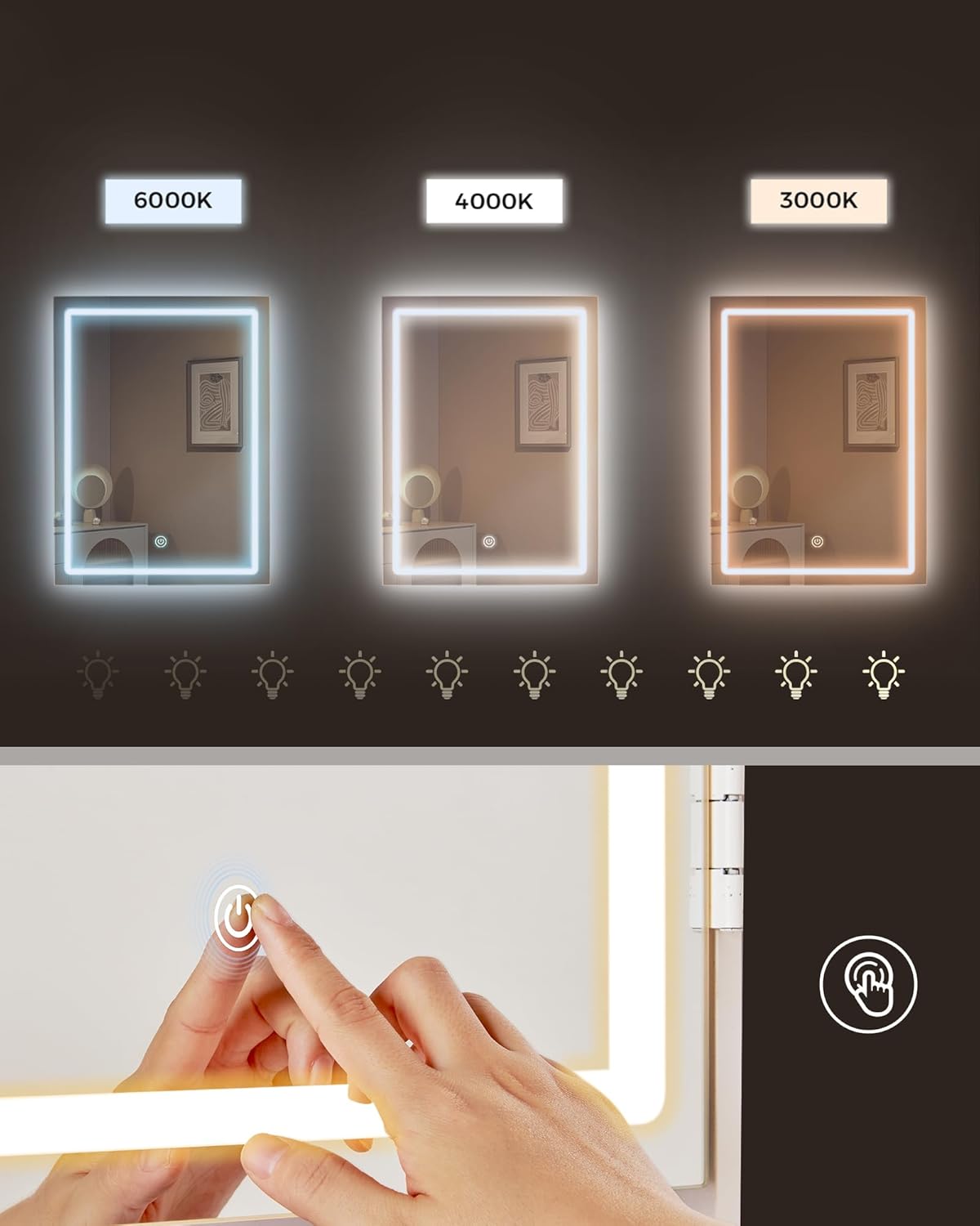 LED osvetljenje sa podešavanjem jačine i boje svetla pruža savršene uslove za šminkanje u svakom trenutku. Dugim pritiskom podešava se jačina osvetljenja, dok se kratkim pritiskom menja temperatura svetla, što omogućava da uvek imate optimalno osvetljenje za precizno nanošenje šminke.
