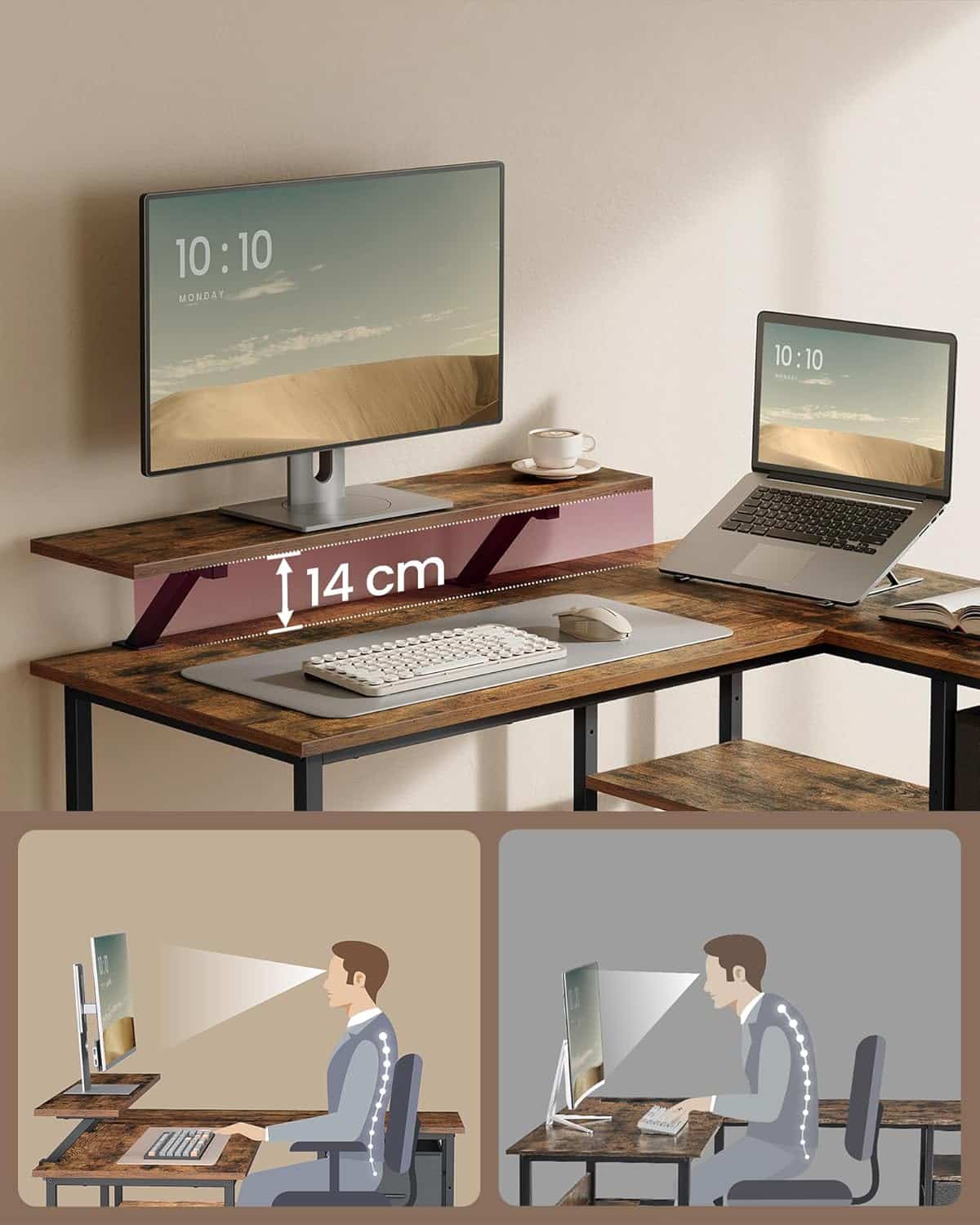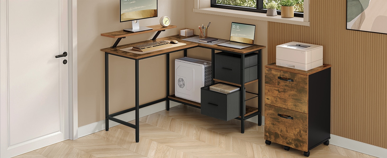 Ovaj ugaoni sto u L obliku dimenzija 105 x 115 x 89,5 cm ima reverzibilan dizajn koji omogućava montažu fioka sa leve ili desne strane. Savršeno se uklapa u ugao kućne kancelarije, spavaće ili dnevne sobe.