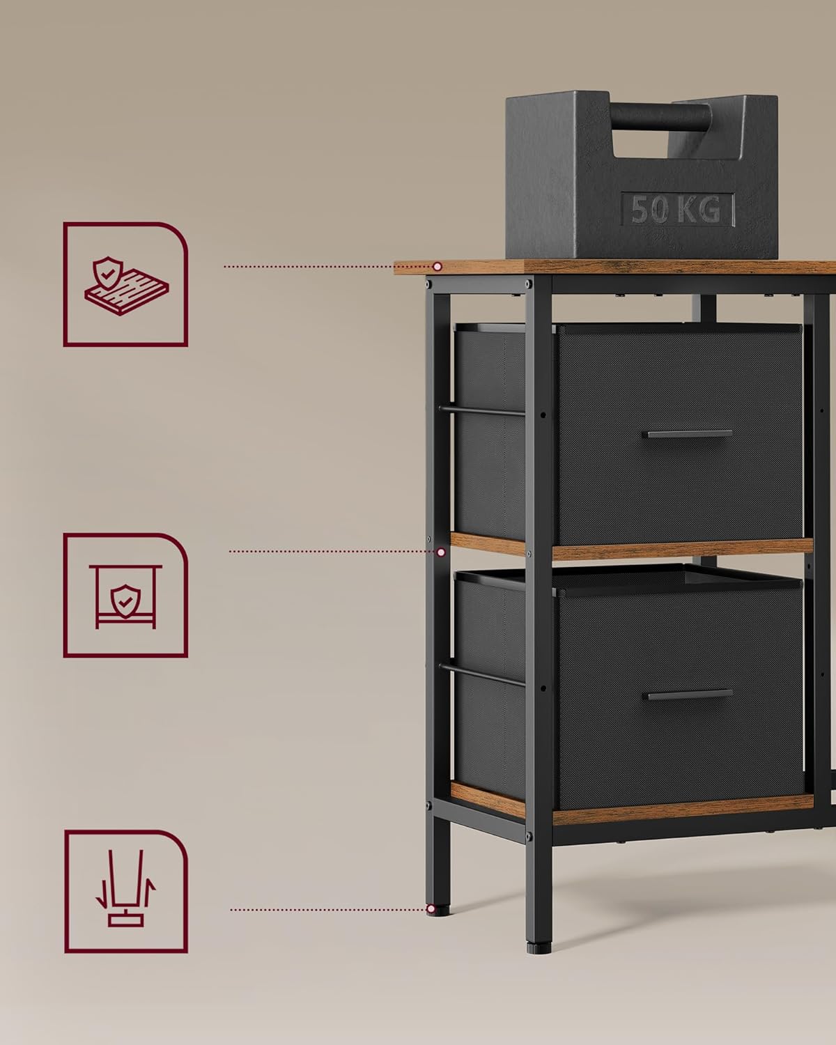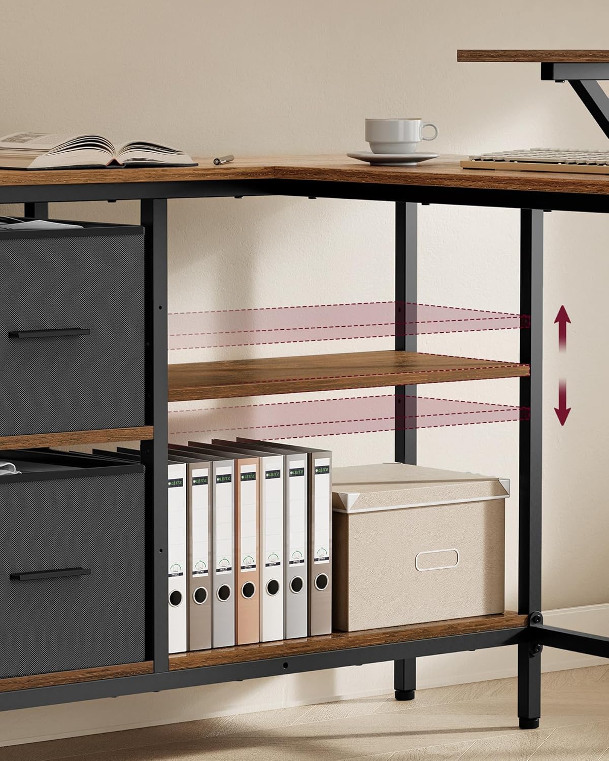 Sto je opremljen sa 2 prostrane fioke za odlaganje, koje nude dovoljno prostora za dokumenta i kancelarijski pribor. Srednja polica je podesiva u 3 visine, tako da je možete prilagoditi svojim potrebama.