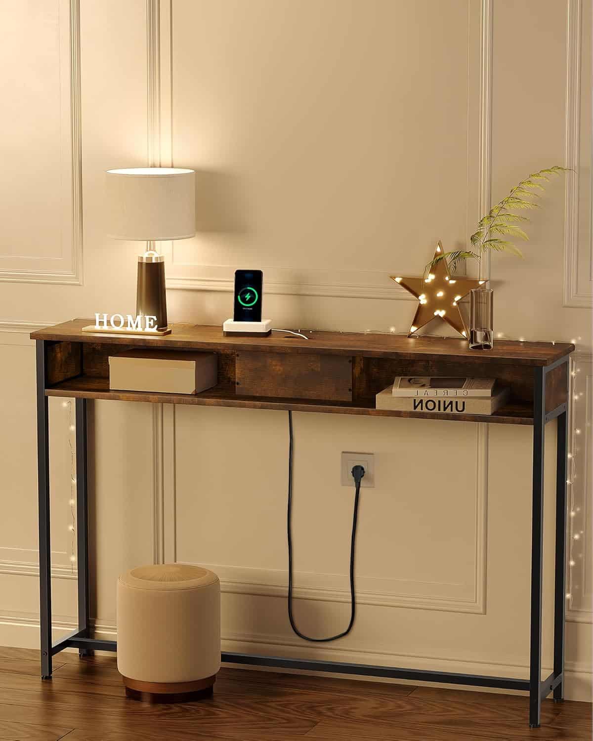 Konzolni sto sa punjenjem – opremljen sa 2 AC utičnice i 2 USB porta, ovaj uski sto omogućava istovremeno punjenje lampe, telefona, tableta ili drugih uređaja.