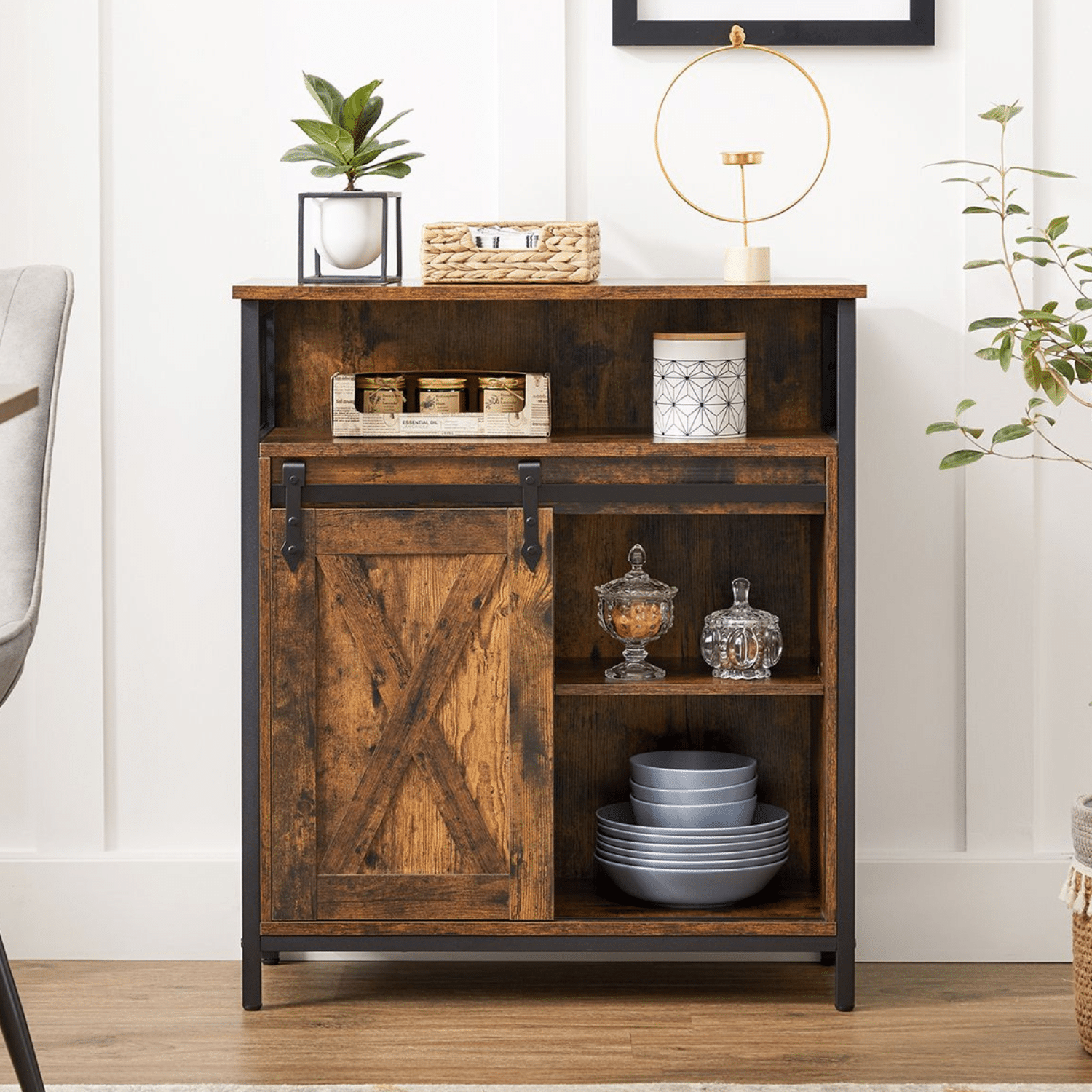 Da industrijskom šarmu kažemo da: Skladištenje može biti dosadno, ali nameštaj za skladištenje ne treba da bude. Drvena vrata, rustični paneli i crni metal čine ovu industrijsku komodu elegantnom.
