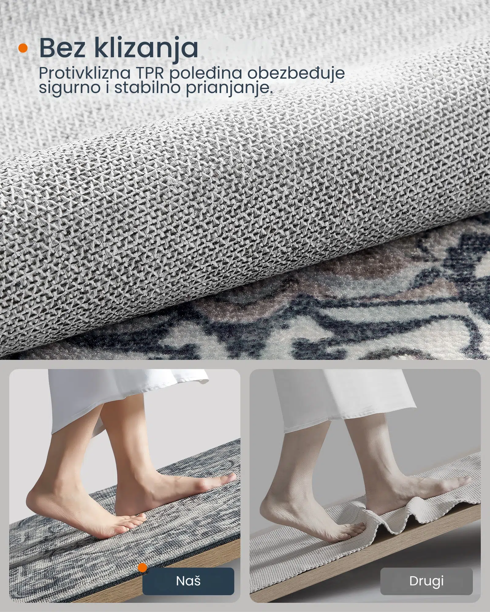 Protivklizni i višenamenski: Donja strana tepiha izrađena je od TPR materijala, što ga čini posebno protivkliznim, pa je savršen za različite vrste podnih obloga, npr. za parket, pločice i drugo.