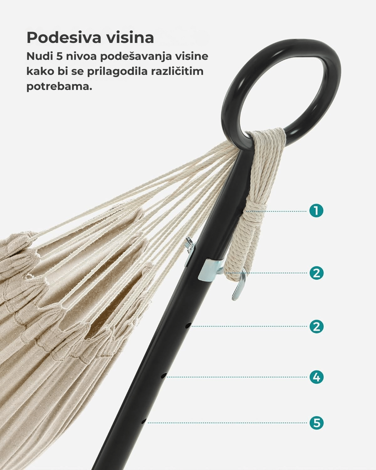 Da li želite da ležite bliže zemlji ili da se lagano ljuljate malo više? Zahvaljujući 5 nivoa podesive visine, lako možete prilagoditi položaj ležaljke prema svojim željama.
