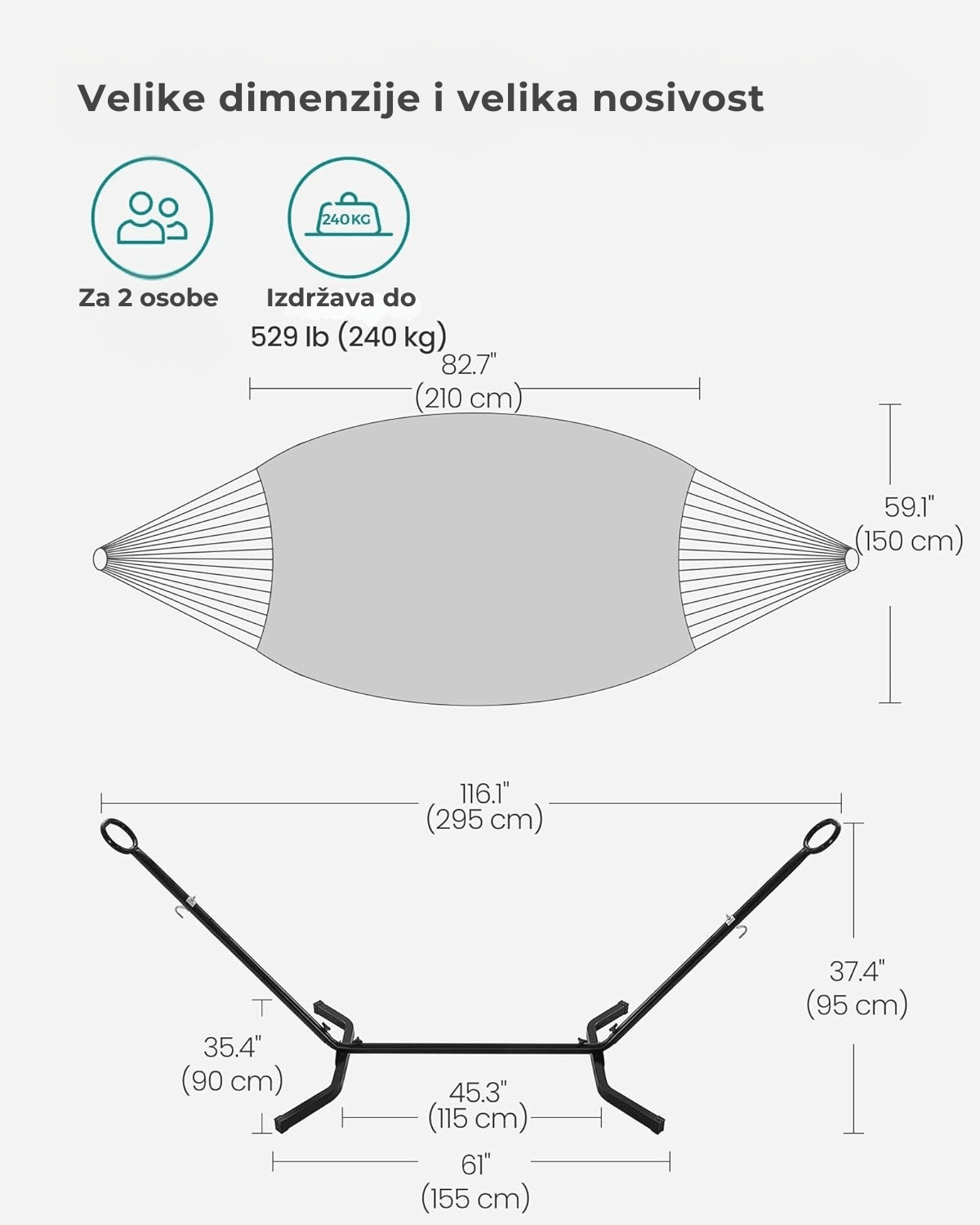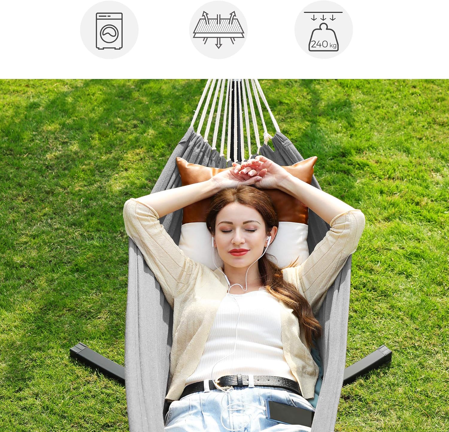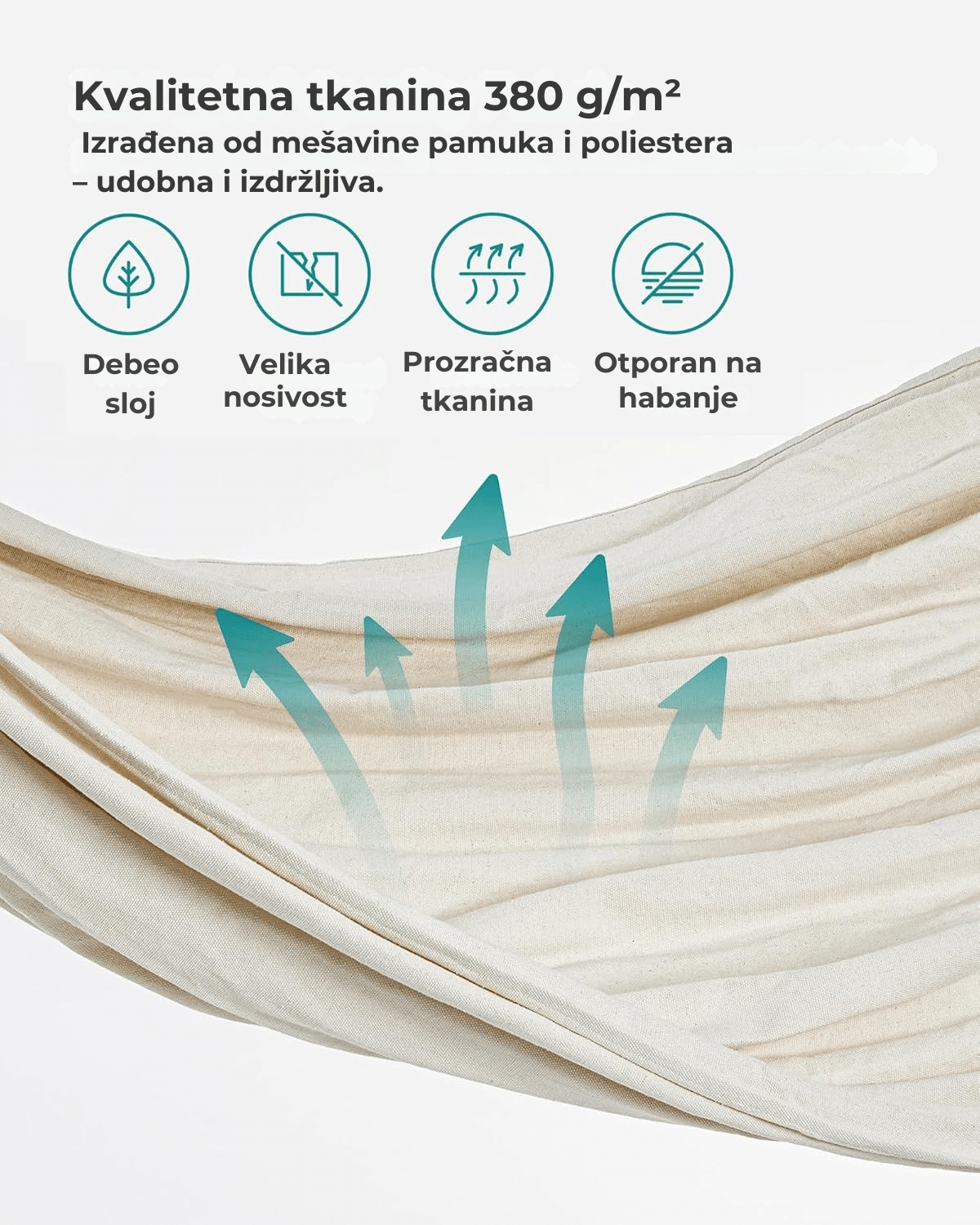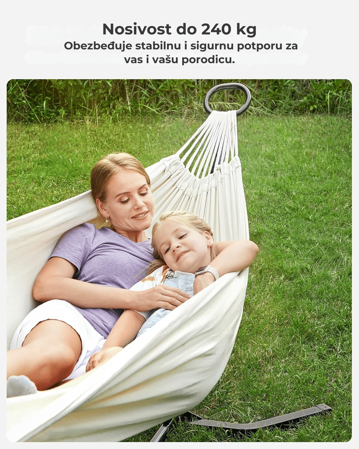 Lezite sa voljenom osobom i uživajte u zalasku sunca ili se opustite sa detetom tokom druženja. Ova viseća ležaljka sa postoljem izrađena je od prozračne mešavine pamuka i poliestera i ima nosivost do 240 kg, što je čini idealnom za opuštanje sa porodicom i prijateljima.