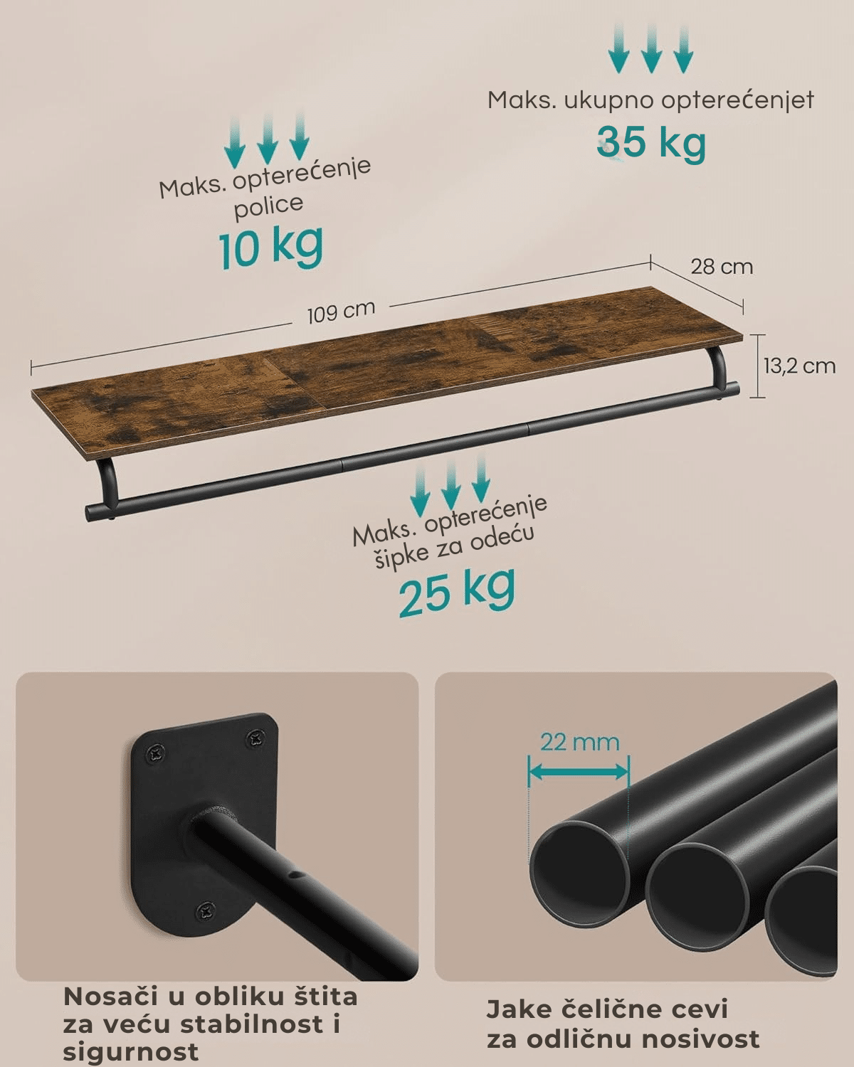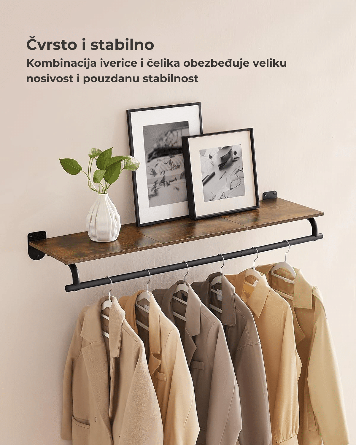 Velika nosivost – izrađena od čvrstog čelika i kvalitetne iverice, ova vešalica može podneti do 60 kg ukupno (polica do 40 kg, šipka do 20 kg).
