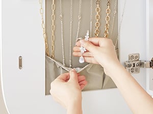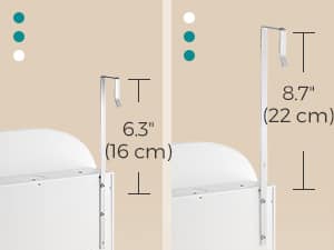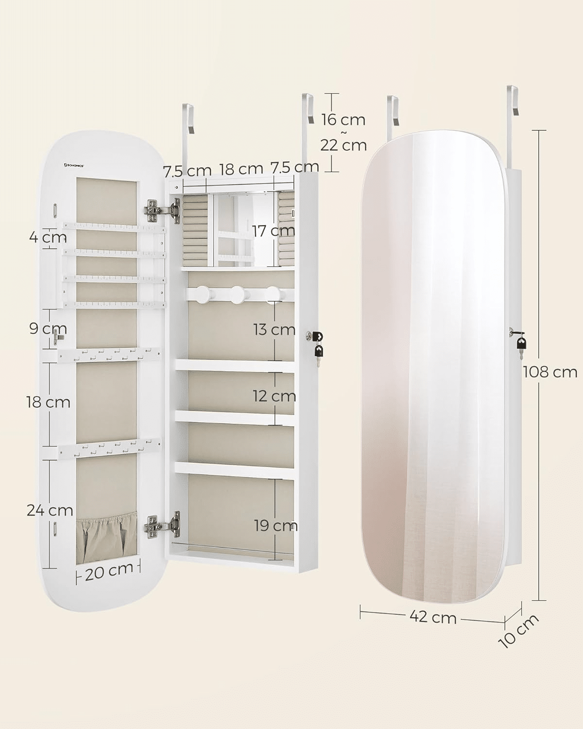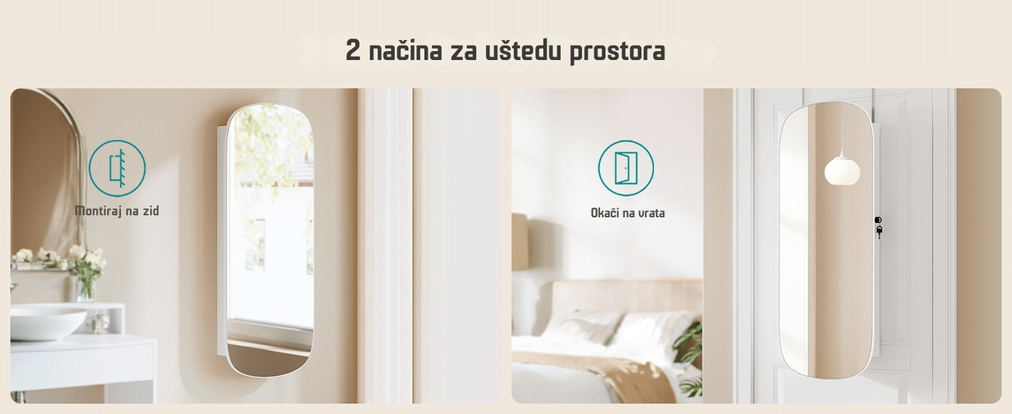 Ormarić za nakit ima 2 različite opcije visine za kačenje na vrata, što ti omogućava da ga prilagodiš svojoj visini.