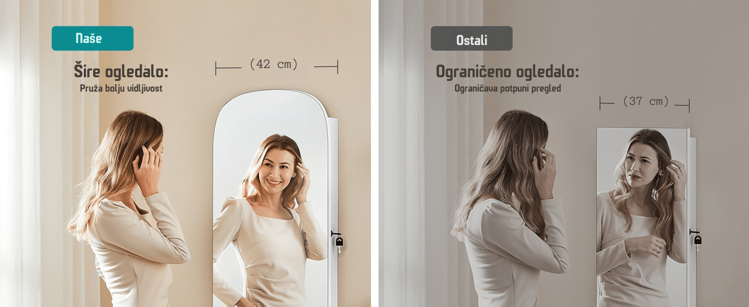 Unapredi svoje iskustvo ogledanja sa našim ogledalom-ormarićem dimenzija 10 × 42 × 108 cm, koje je 5 cm šire od standardnih. Lako uoči i dotera svaki detalj tokom jutarnje rutine.