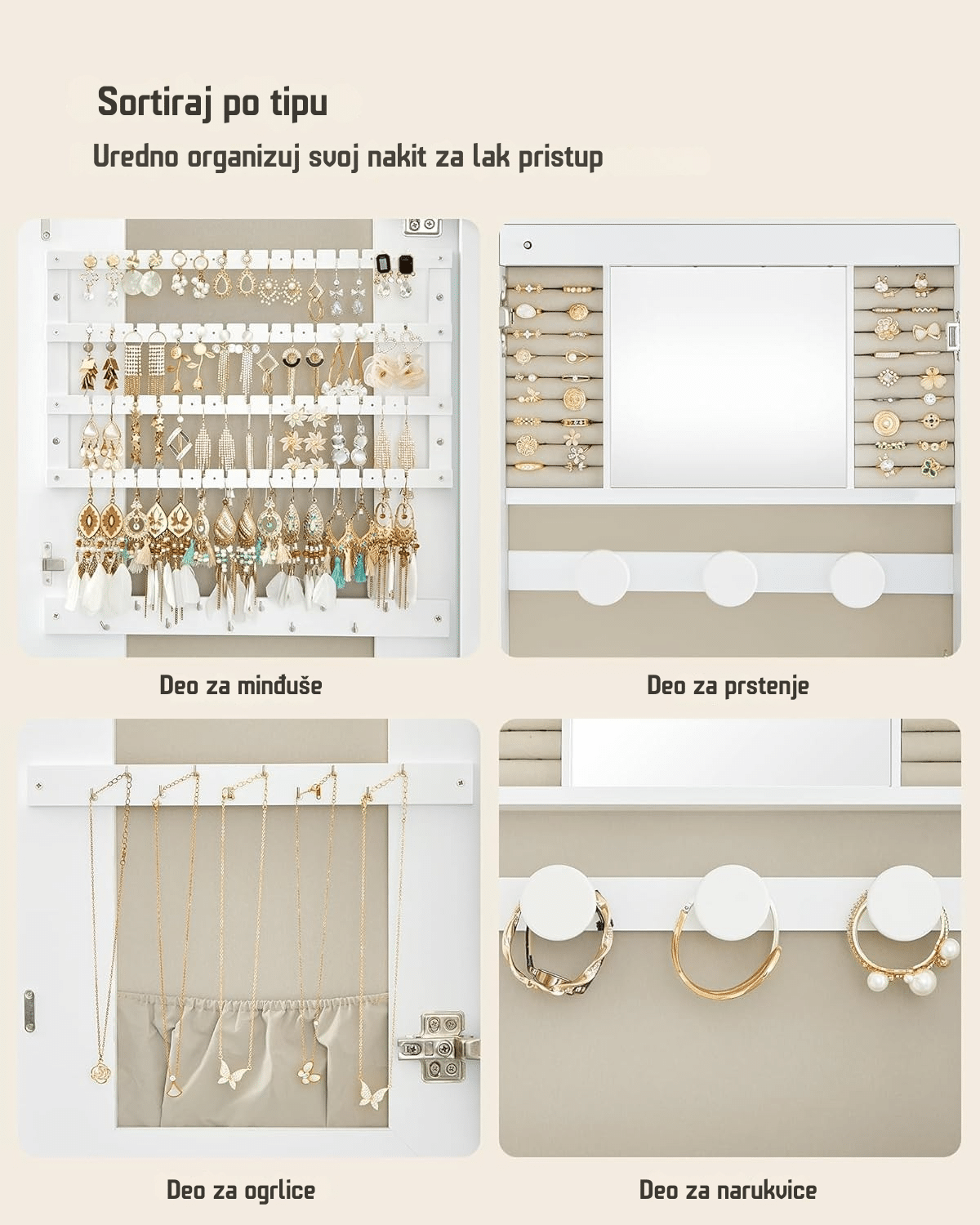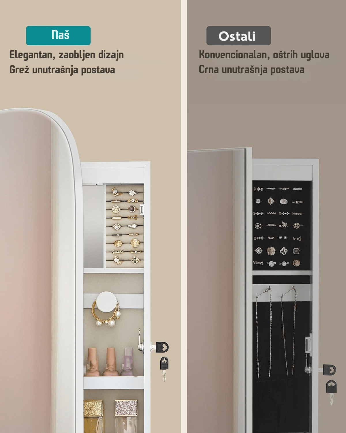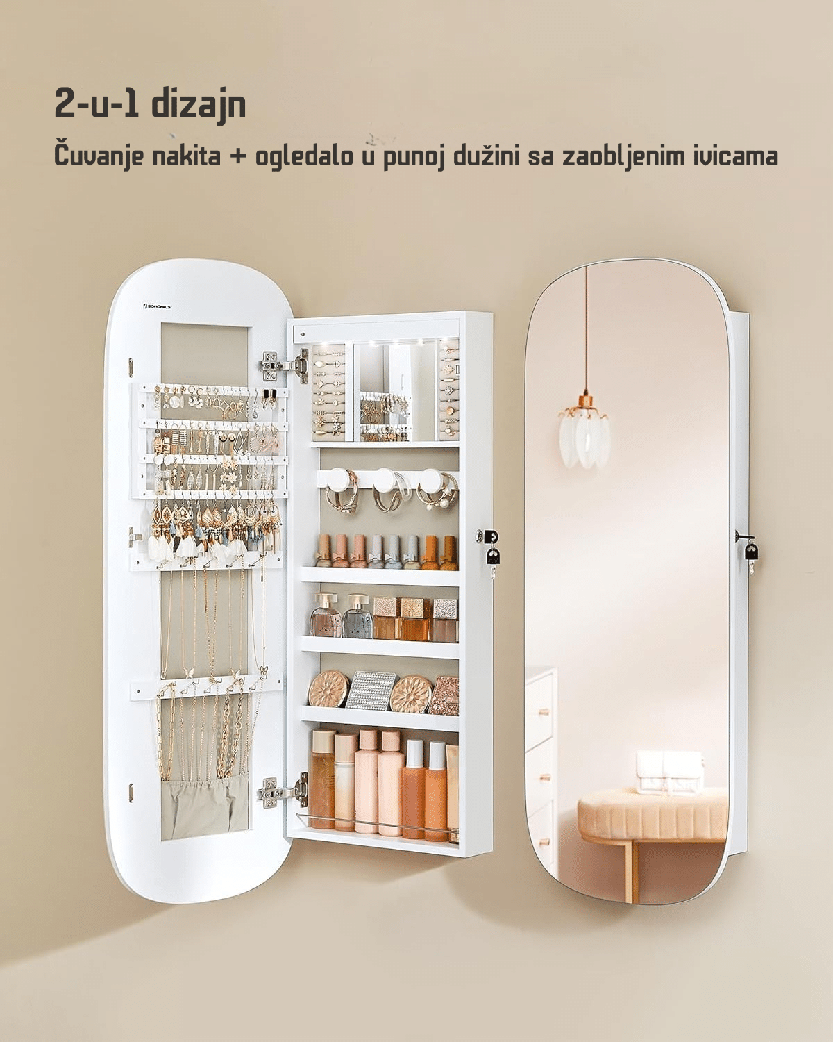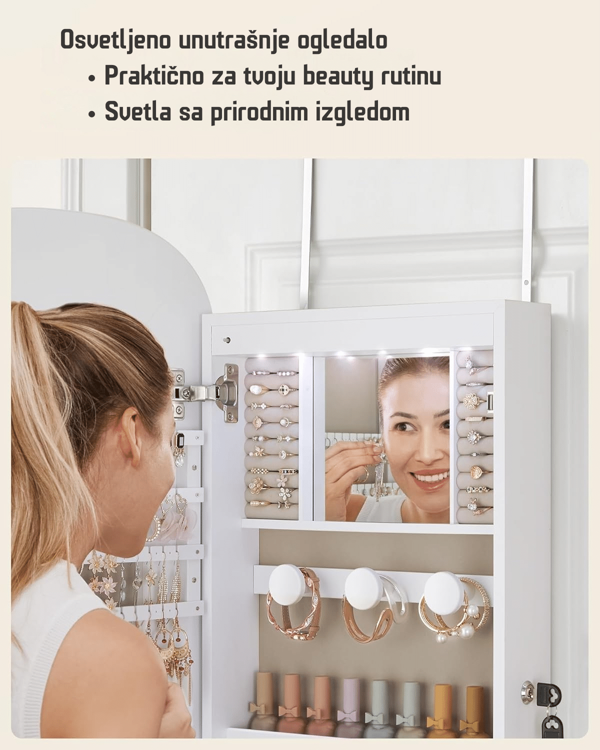 Ormar za nakit sadrži unutrašnje ogledalo, pa nema potrebe stalno otvarati i zatvarati vrata tokom šminkanja. U kombinaciji sa LED svetlima prirodnog izgleda, ovo je savršen pratilac za tvoj makeup ritual.
