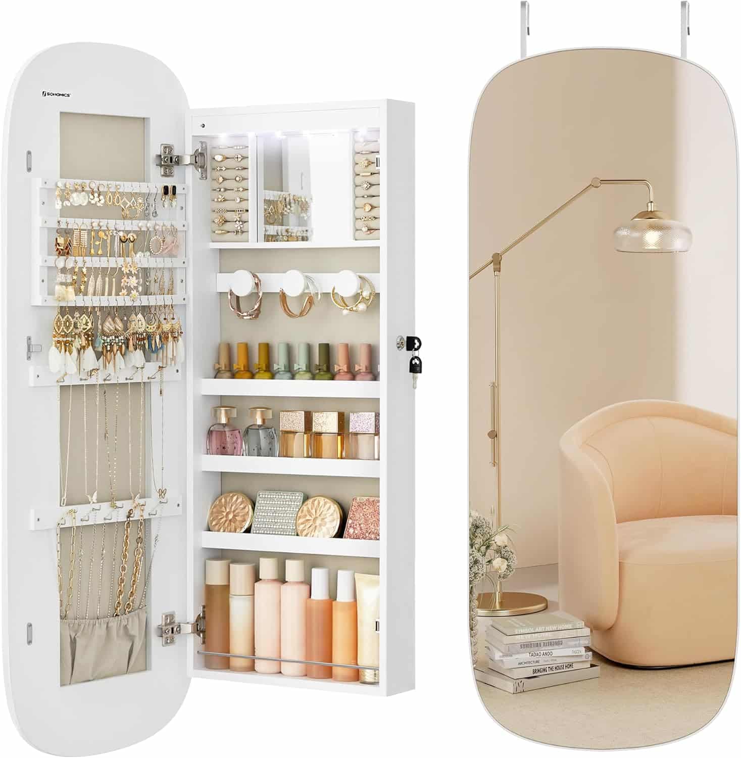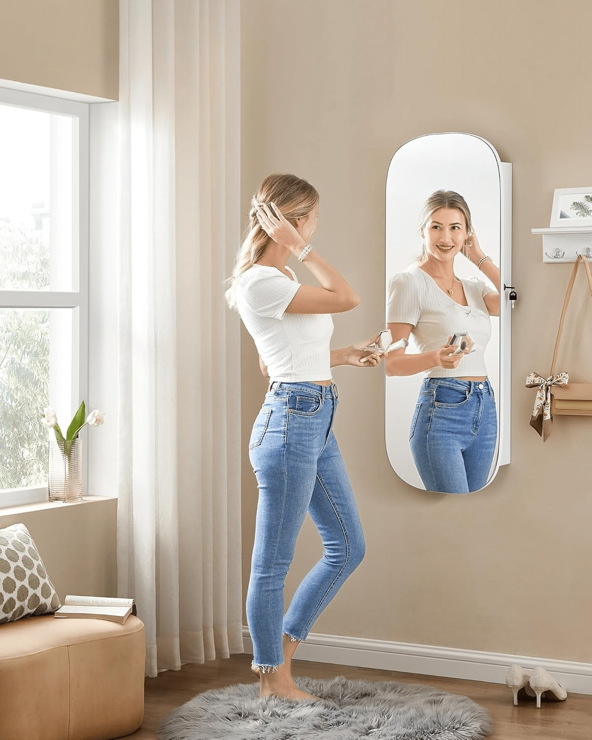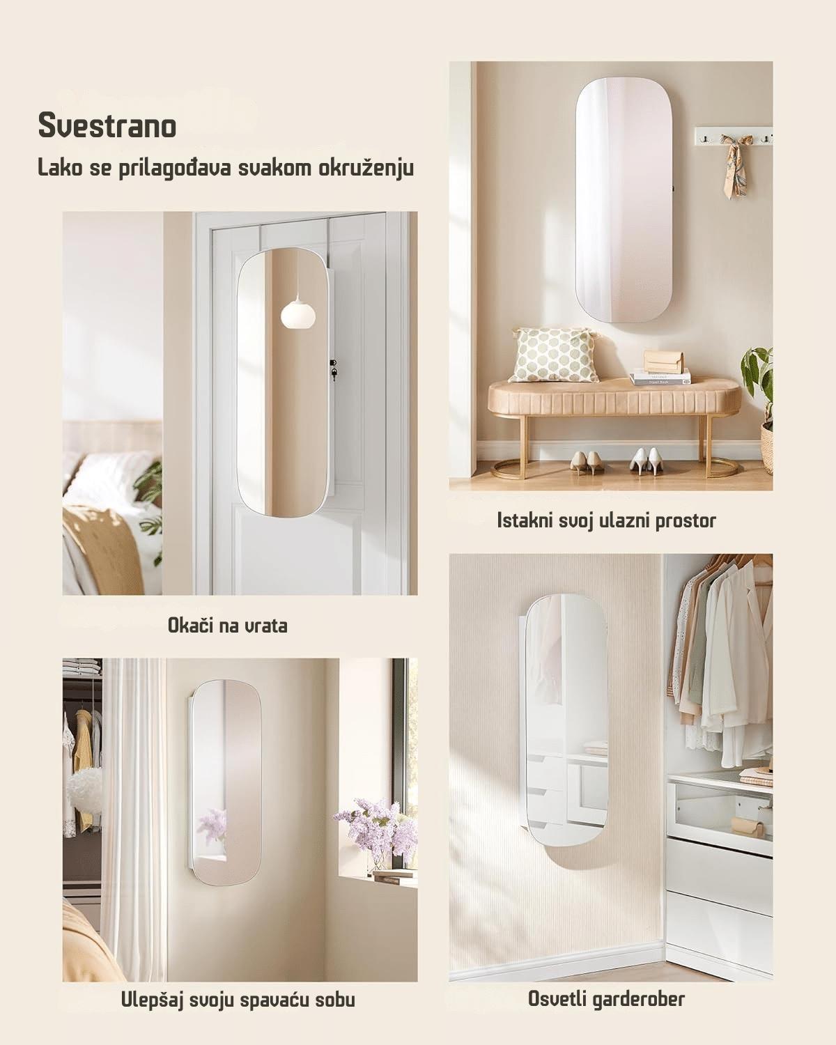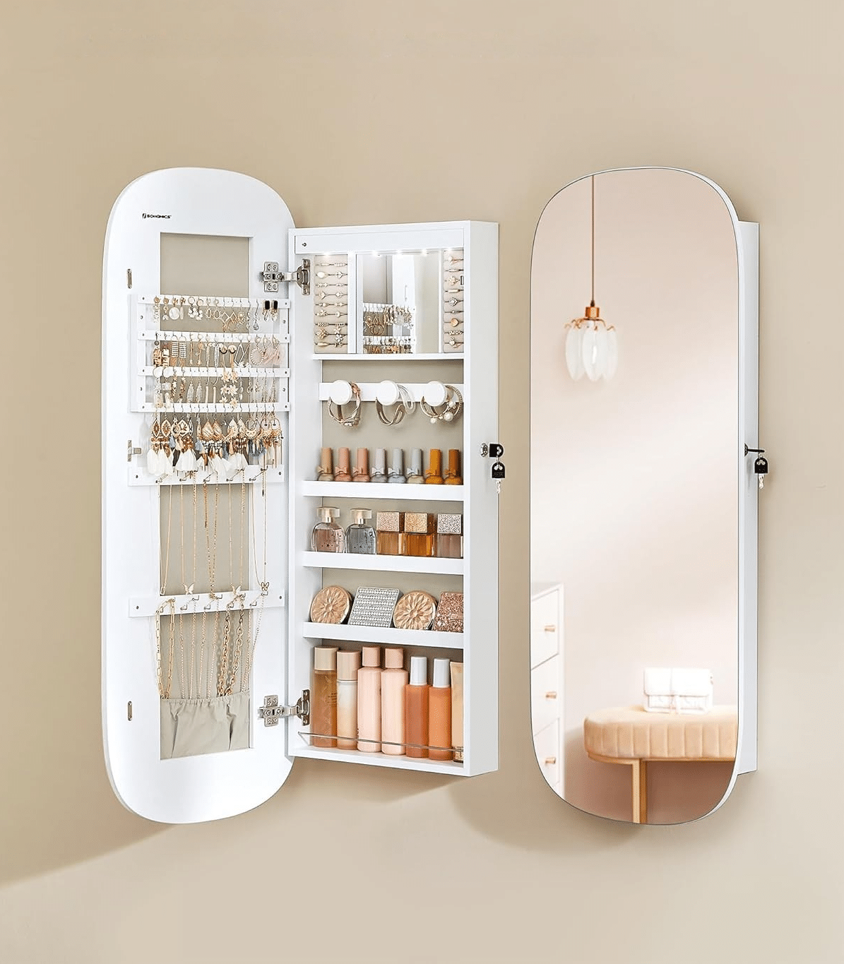 Ormar za nakit sadrži unutrašnje ogledalo, pa nema potrebe stalno otvarati i zatvarati vrata tokom šminkanja. U kombinaciji sa LED svetlima prirodnog izgleda, ovo je savršen pratilac za tvoj makeup ritual.